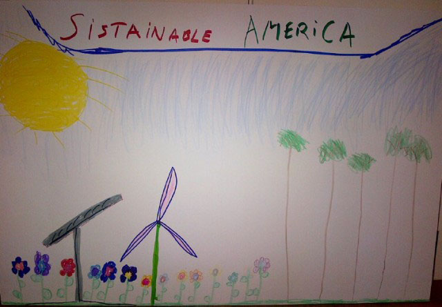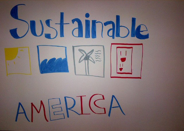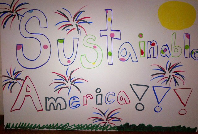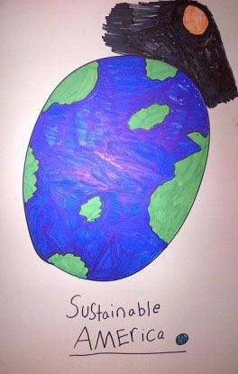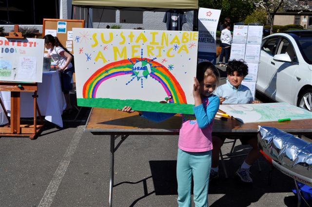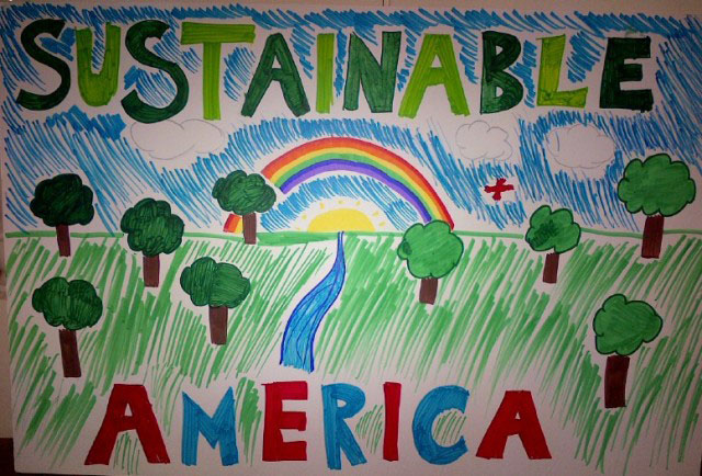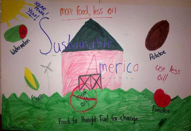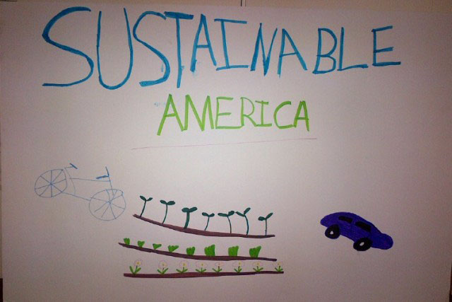 It was a fun, family event, so we decided to host a kids poster contest. We supplied the poster board and markers, and the kids brought their creativity. We asked them to draw their vision of a sustainable America. The winners were a brother and sister team—Emily, 15, and Ben, 12. Here are pictures of most of the entries and scenes from the day.