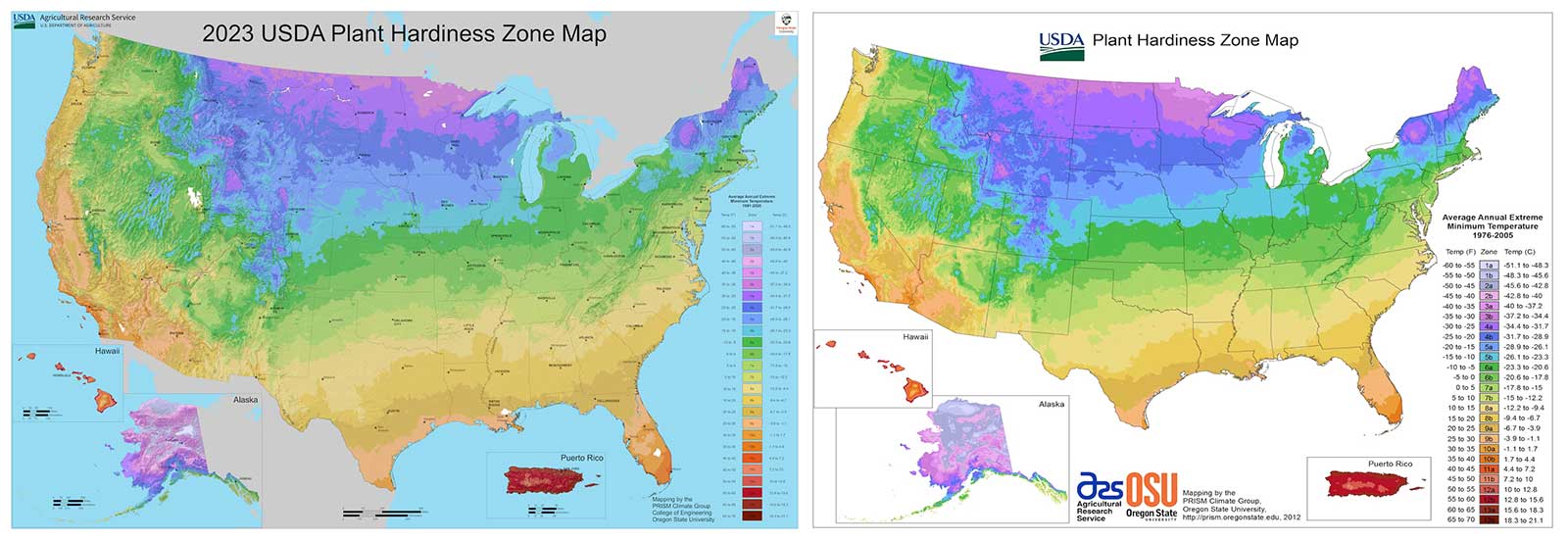 The USDA plant hardiness map is created in collaboration with the PRISM Climate Group at Oregon State University. This year’s map incorporates data from almost twice as many weather stations as were used for the previous version, and is about 2.5 degrees Fahrenheit warmer, with half the country shifting to warmer plant hardiness zones.