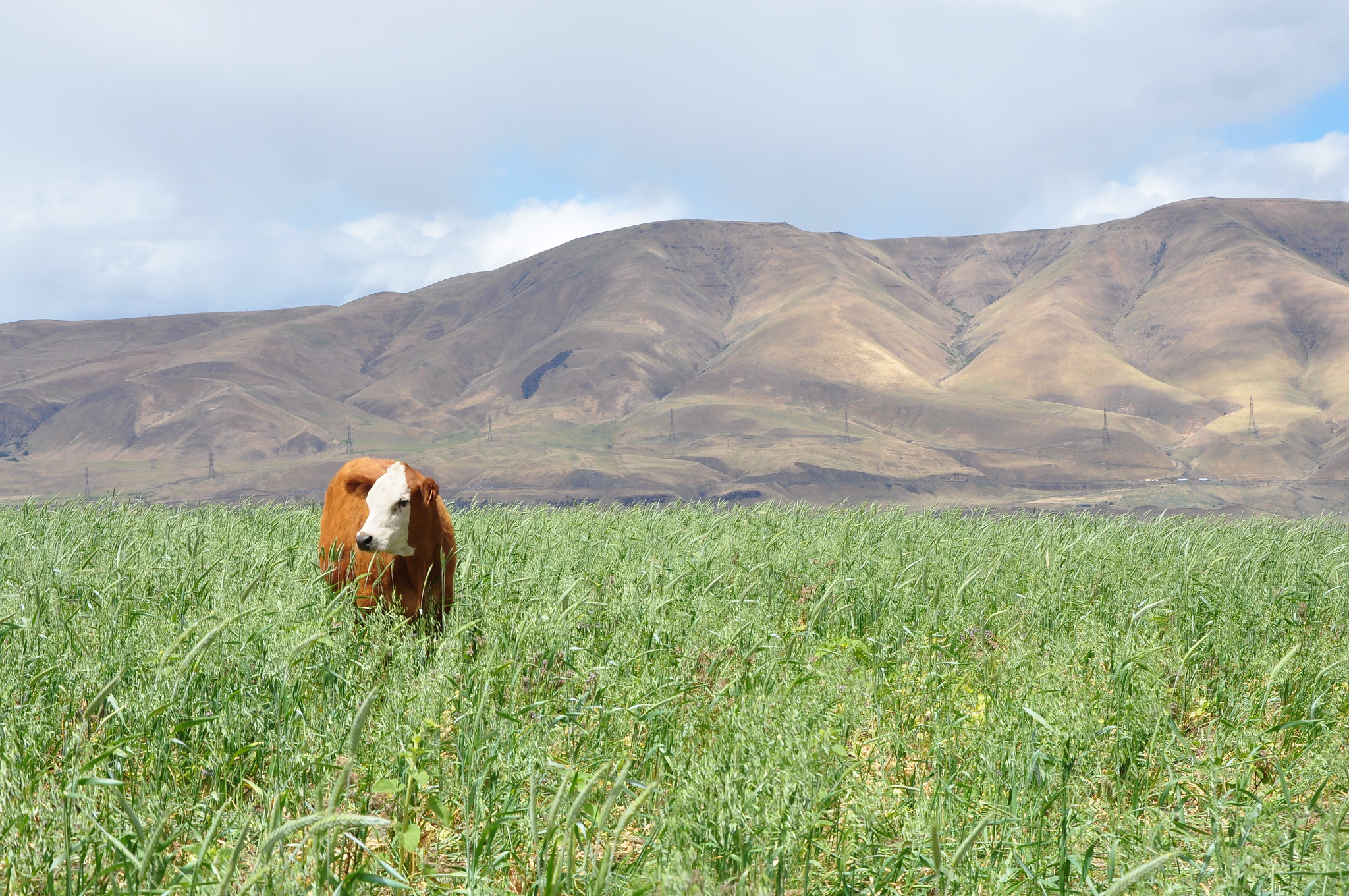 A cow grazes in a field with a cover crop planted in order to improve soil health
